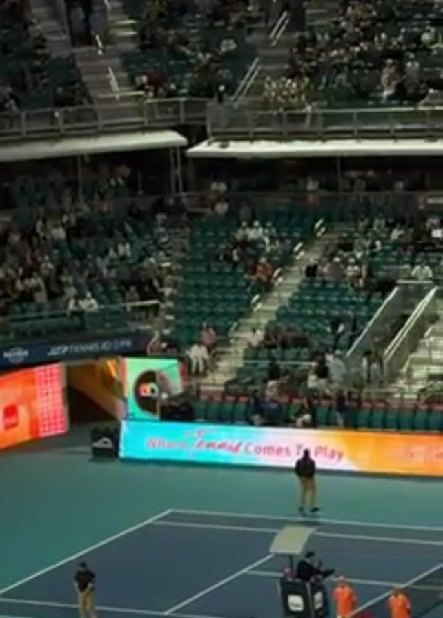 n overhead shot of a tennis match in a stadium with many spectators. A tennis court with blue lines is visible in the foreground. Two players in orange outfits are seen on the court. Numerous people are seated in the stands, which are arranged in tiers. Electronic billboards displaying "Miami Open" and "Where Tennis Comes To Play" are located along the perimeter of the court. Several individuals, possibly referees or staff, are seen standing around the court. Cameras and technical equipment are also present at the bottom of the frame.
