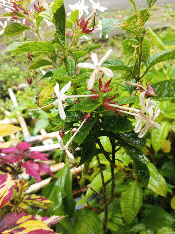 A plant with glossy green leaves and white, star-shaped flowers stands out. Crimson red bracts surround the base of each flower, creating a vibrant contrast. Some leaves exhibit minor damage, adding a touch of imperfection. Other colorful plants are in the background. The overall scene is lush and vibrant, showcasing the unique beauty of the flowering plant.