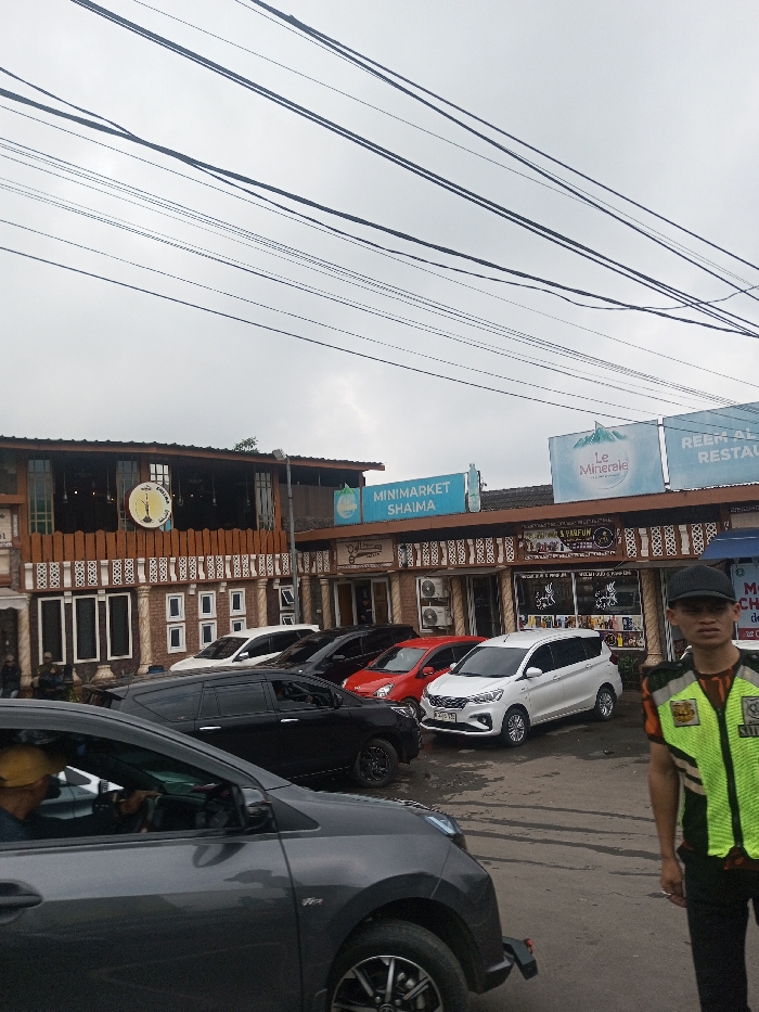 A street scene shows a row of stores with awnings. Signs read "MINIMARKET SHAIMA" and "Le Minerale REEM AL RESTAU." Cars of various colors are parked in front of the stores. A man in a neon green safety vest and black cap stands on the right. Another car, gray, is visible in the foreground. A multitude of electrical wires cross the overcast sky.