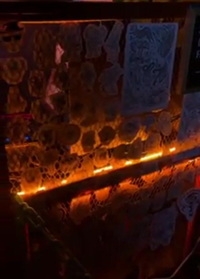 A young man DJs in a dark room. He is behind a decorative barrier illuminated with orange lights. The barrier is covered with small papers, possibly stickers. Behind him, speakers sit on a shelf. In front of him are musical instruments. Two disco balls hang from the ceiling.