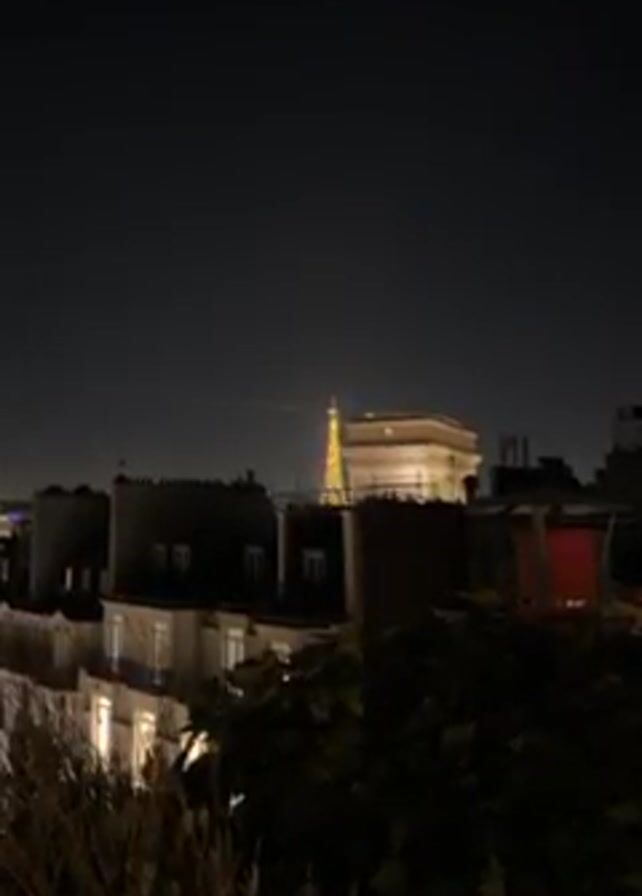 night-time view of the Eiffel Tower and the Arc de Triomphe in Paris, France. The Eiffel Tower is illuminated with golden lights and a bright beam of light shoots out from the top. Both monuments are framed by the rooftops of buildings and trees in the foreground, all set against a dark sky.
