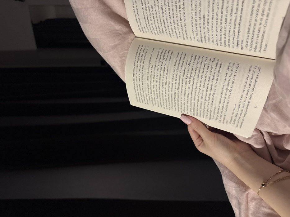 The scene depicts a close-up view of a person's left hand holding an open paperback book. The hand has fair skin and manicured nails with a light pink polish. A delicate, gold-colored bracelet with a small, dark spherical charm is visible on the wrist. The book is open to pages 10 and 11, displaying text primarily in the Bulgarian language. The pages are off-white. The book and hand rest on a light pink, possibly fabric surface, consistent with bedding or soft furnishings. In the background, dark, vertically aligned fabric, likely curtains or drapes, creates a subdued environment. The lighting is soft and ambient, illuminating the book and hand. This indoor scene is situated in Harmanli, Bulgaria.