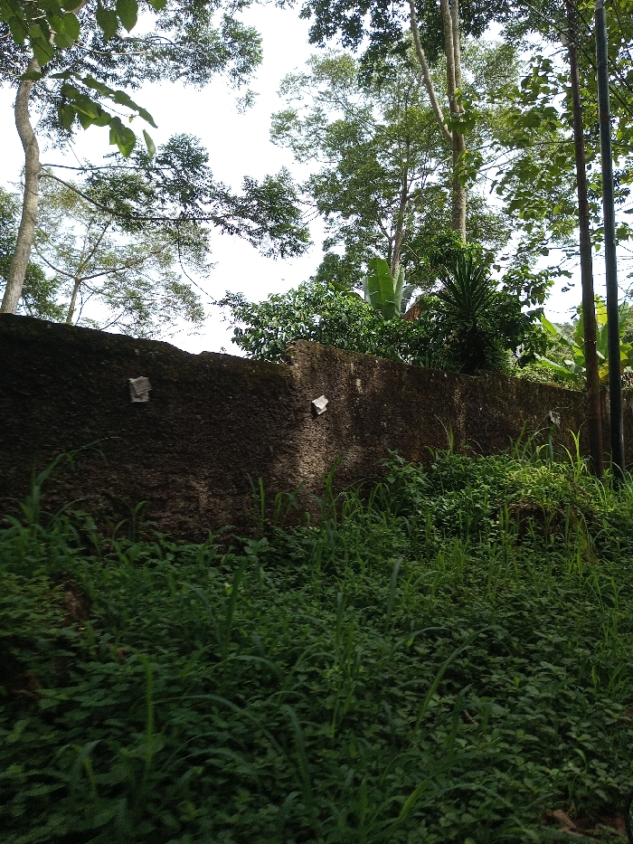 The scene, set in Kandenuwara, Sri Lanka, depicts an exterior view characterized by a weathered wall and dense natural vegetation under a bright sky. The foreground is occupied by a thick expanse of green undergrowth, consisting of various low-lying plants and taller grass blades. In the midground, a dark, textured concrete or stone wall, appearing several feet in height, extends horizontally across the frame. Two small, light-colored, discolored rectangular objects are affixed to the wall's surface, one positioned left of the image center and the other right of center. The top edge of the wall exhibits an irregular contour. Above and behind the wall, numerous trees with green canopies and visible trunks rise against a bright, uniform sky. Immediately beyond the wall, smaller bushy plants, a large banana leaf, and a spiky, palm-like plant are visible. Sections of slender utility poles are present on the far right edge of the frame. Direct sunlight illuminates portions of the wall and the upper foliage. No individuals or active interactions are depicted within the scene.
