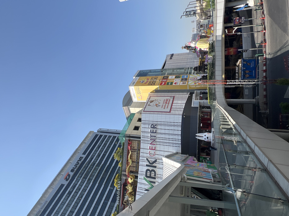 The image displays a daytime urban scene. Tall buildings dominate the skyline under a clear blue sky. The MBK Center is prominently featured with adjacent businesses. A pedestrian walkway with glass railings is visible in the foreground. Streetlights, signage, and pedestrian traffic are present, suggesting a busy commercial area.
