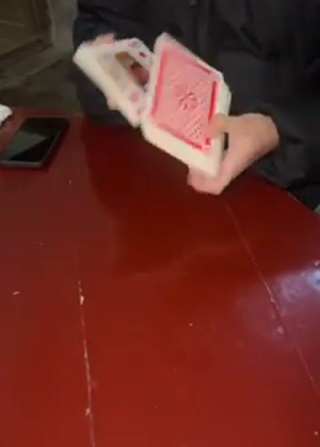 A person in a black jacket is sitting at a red table. A black cell phone and a white tissue sit to the left of the person on the table. The person is holding a deck of playing cards. The person then cuts the cards into two piles on the table. The person then riffles the two piles of cards together. The person then squares up the deck.