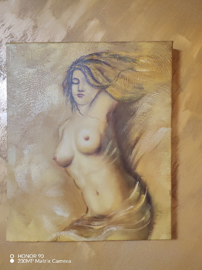 A canvas painting depicts a nude woman with flowing hair against a textured, golden background