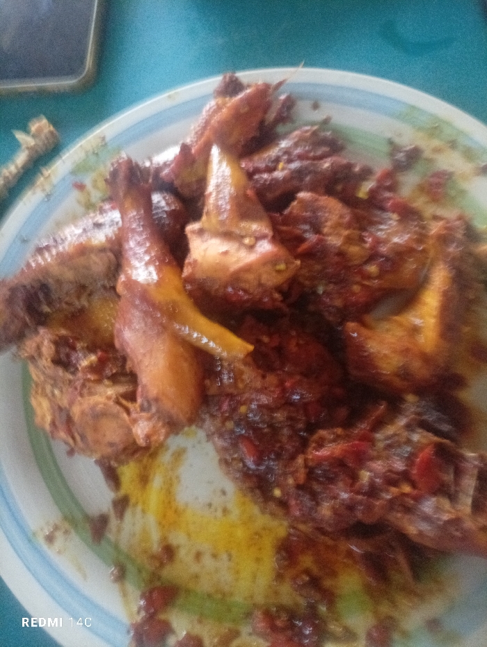 A plate of cooked chicken pieces heavily coated in a reddish sauce, possibly chili-based
