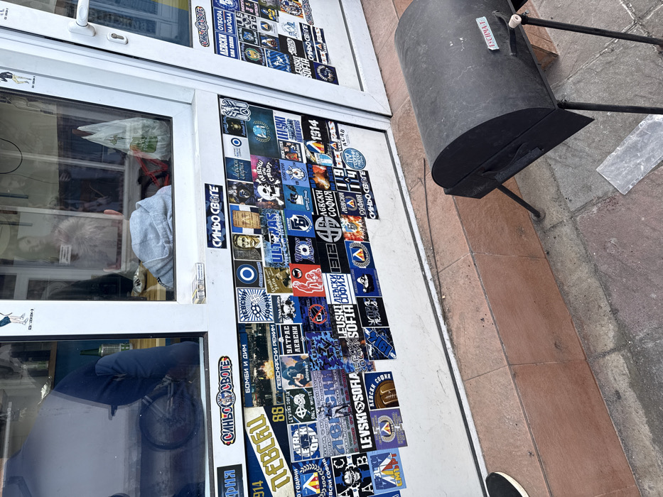 The image depicts the exterior of a building, likely a commercial establishment, located in the city of Svoge, Bulgaria. The upper section of the image shows a large glass window. Through the window, the interior of the establishment is partially visible, featuring reflections. A person wearing a grey hooded sweatshirt is seen from behind, seated inside and leaning forward. Another person, possibly a woman with light-colored, fluffy clothing or hair, is reflected in the glass further inside. A partial view of a bicycle wheel and a bottle are visible indoors to the left. A clear plastic bag is hanging inside near the right side of the window. A pack of cigarettes rests on the windowsill between the panes. Below the window, the lower portion of the building's facade, including a door on the right, is heavily covered with numerous stickers. These stickers are predominantly blue, white, and black, and feature motifs associated with the Levski Sofia football club, including club crests, skulls, fists, the year "1914," images of Vasil Levski, and text such as "ЛЕВСКИ СОФИЯ," "УЛТРАС," "БОМБИ И ДИМ," and "СИНЬО СВОГЕ." A white door frame and handle are visible on the right side. The ground directly in front of the building consists of a raised terracotta-tiled step, with grey interlocking pavers beyond it. On the paved ground to the right, a black, barrel-shaped BBQ grill with four thin legs is positioned. The word "TECHMAT" is visible on the side of the grill. A piece of clear plastic sheeting lies on the ground near the grill. A thin, dark rod or wire rests on the terracotta step. The toe of a black shoe is visible on the far left of the paved ground. The scene is illuminated by daylight.