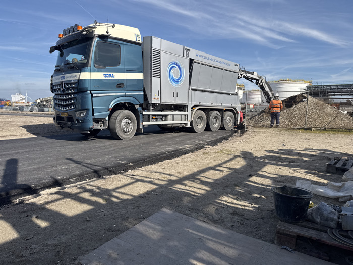 The image displays an industrial outdoor environment, identified as Maasvlakte in Rotterdam, Netherlands. A blue and white Mercedes-Benz heavy-duty truck, branded "WBL VAN DER WAL" and "WWW.UUDUURVANDERWAL.NL," occupies the center, positioned on a recently laid dark asphalt or similar paved surface. The truck is equipped with a specialized grey body, featuring a blue swirling logo, from which a mechanical arm extends towards a substantial pile of coarse gravel. One individual, wearing an orange high-visibility jacket, blue trousers, and a white hard hat, stands with their back mostly to the camera, observing or operating the mechanical arm's interaction with the gravel pile. In the background, large white cylindrical storage tanks with yellow piping and railings are visible, along with extensive industrial scaffolding and structures. Further in the distance to the left, a large white cargo ship, shipping containers, and a wind turbine indicate a busy port area. The foreground consists of bare earth with construction-related debris, including wooden pallets, a black bucket, tarps, and coiled cables. The scene is illuminated by direct sunlight under a clear blue sky with scattered wispy clouds, casting distinct shadows on the ground.
