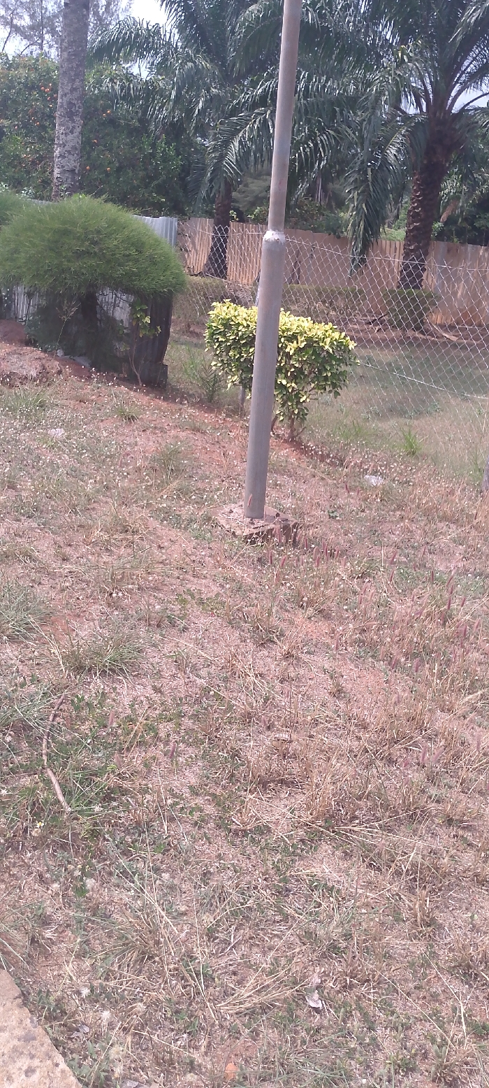 This image presents an outdoor, static scene located in Nsukka, Nigeria. The foreground and much of the midground consist of reddish-brown soil sparsely covered with dry, light brown grass and scattered green weeds, including small plants with white flowers. A light-colored concrete or stone curb is visible along the bottom-left edge. A grey cylindrical pole, possibly a street light pole, stands slightly off-center, anchored by a concrete base in the dry ground. To the left of the pole is a dense, dark green, rounded shrub or hedge. To the right of the pole, a smaller shrub with variegated light green and yellow leaves is present. Behind these shrubs and the pole, a chain-link fence is visible, running horizontally across the midground. Beyond the chain-link fence, a corrugated metal fence, appearing light brown or tan, can be seen. The background features lush green foliage and several tall palm trees with dark trunks. A tree with a lighter-colored trunk and green foliage is visible on the far left of the background. No individuals, animals, or actions are depicted in the scene.