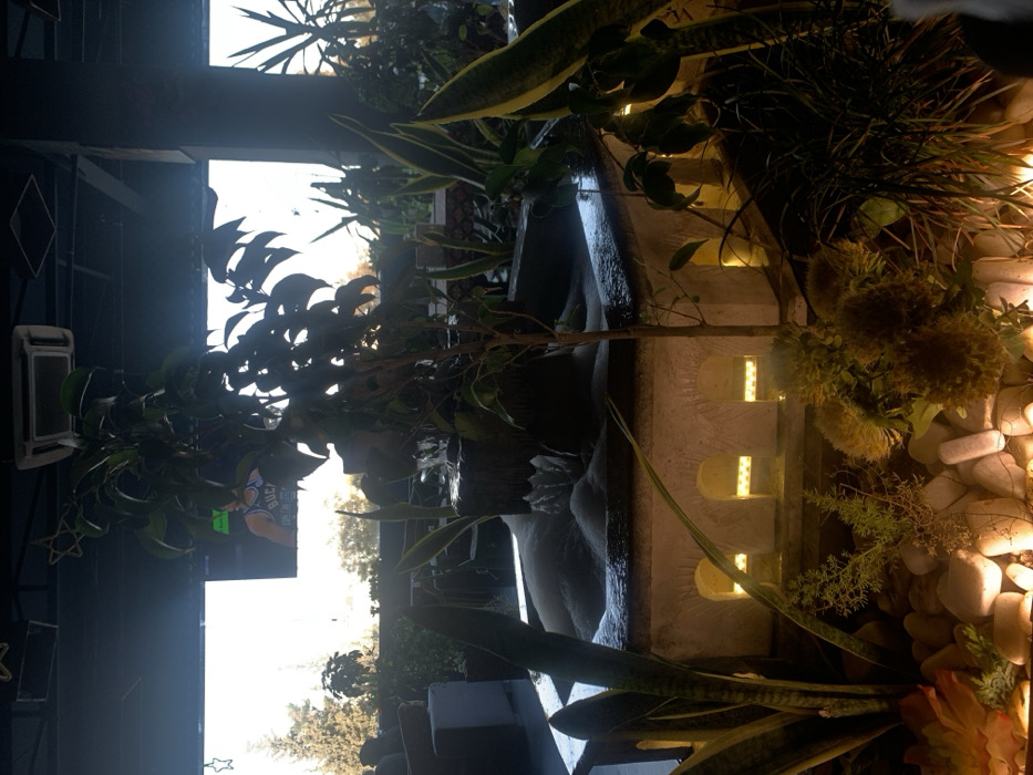 The image captures an indoor area, likely a café or lounge, situated in Barza Municipality, Syria. The foreground features a multi-tiered decorative fountain, predominantly composed of a miniature building-like structure with five illuminated arched windows emitting a warm, yellow light. Water is visible bubbling within the fountain's upper basin. Surrounding the fountain's base are numerous decorative white stones and various potted plants, including several snake plants and other leafy green varieties, some with spherical, textured blooms. A small tree with dark foliage grows vertically from the fountain structure. Beyond this interior display, a large window or opening reveals an outdoor environment. Evergreen trees and dark-colored outdoor seating are visible. A large screen or television is mounted, displaying a male individual wearing a basketball jersey with the word "BUCKS" printed on it. The outdoor lighting suggests either an overcast day or late afternoon conditions. The interior ceiling is dark, from which an air conditioning unit and star-shaped decorative elements are suspended. No individuals are discernible within the visible areas of the scene.