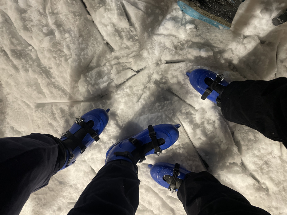 A low-angle shot captures three pairs of blue ice skates on a snow-covered surface, likely a frozen body of water, marked with cracks. The wearers are partially visible, donned in dark pants that blend with the shadows. The skates' black buckles and laces contrast against the bright blue plastic and the white, textured snow. Light reflects off the snow surface, creating a stark, high-contrast image.