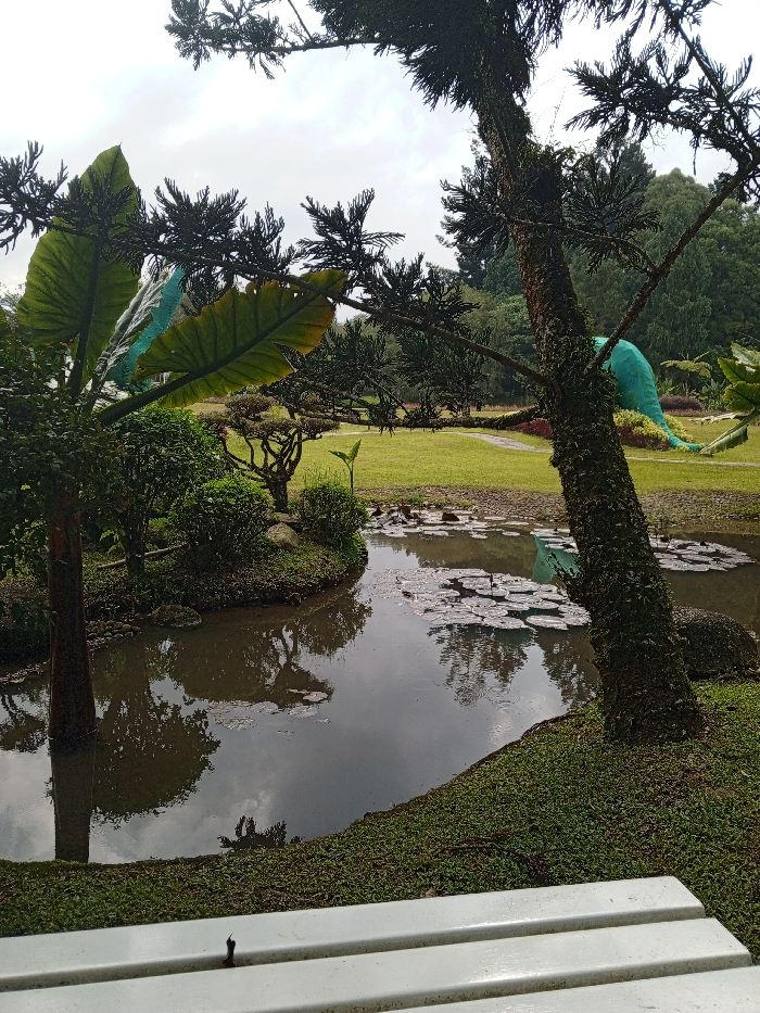 A tranquil garden scene features a pond with lily pads, reflecting the cloudy sky. Lush greenery surrounds the pond, including large-leafed plants, a bonsai-like tree, and grass. A textured tree trunk stands prominently to the right. In the distance, a green dinosaur statue adds a whimsical touch. A partial view of a white bench occupies the foreground, providing a sense of peaceful observation.