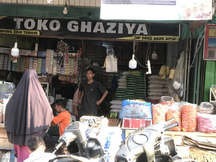 The image displays the exterior of an open-fronted general store named "TOKO GHAZIYA" in Langsa, Indonesia, under bright daylight