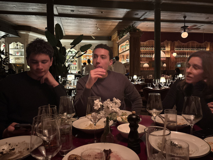 Three individuals sit at a table in a dimly lit restaurant. Plates of food, glasses, and a pepper grinder are scattered across the red-clothed table. The man on the left has dark hair and is looking down, possibly at his phone. The man in the middle is looking off to the side and gesturing with his hand. The woman on the right is facing towards the center, with her mouth open as if speaking. The restaurant's decor includes dark wooden features, shelves of bottles, and decorative plants.