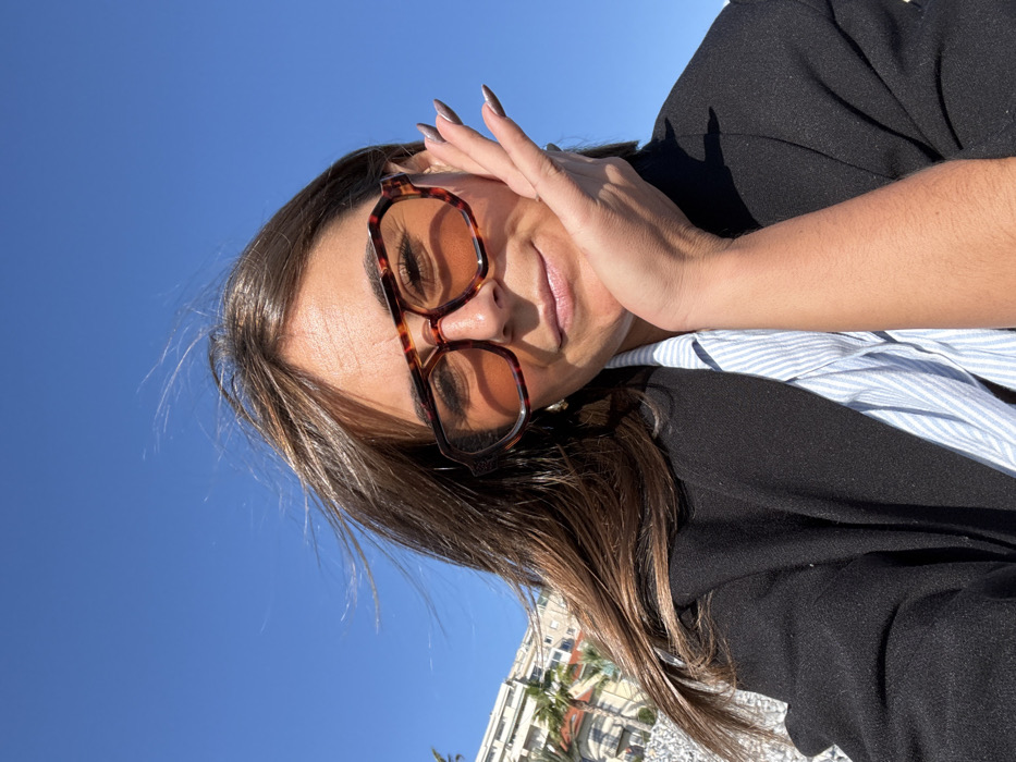 A female individual is depicted in a close-up outdoor photograph under a clear blue sky. She has medium-brown hair, appearing to be moved by a breeze to her right. She wears large, tortoiseshell-patterned eyeglasses with amber-tinted lenses and a prominent double bridge. Her right hand, with metallic-toned nail polish, is positioned beneath her chin, resting against her jawline. She is dressed in a black blazer over a light blue and white striped collared shirt. In the background, to the left, multi-story buildings with light-colored facades and visible balconies are present, interspersed with several green palm trees. A light-colored, possibly pebbled ground surface is faintly visible in the lower left. The scene is illuminated by bright sunlight. The architectural style, palm trees, and coastal setting are indicative of the Promenade des Anglais area in Nice, France.