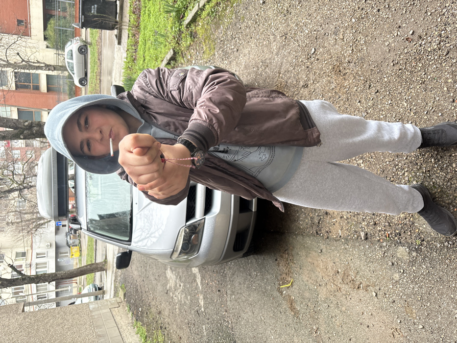 The scene is situated outdoors in the city of Targovishte, Bulgaria, on what appears to be a wet, overcast day. The ground consists of damp gravel and dirt, showing scattered puddles. A young male, appearing to be a teenager, stands centrally, facing the camera. He wears a light blue hooded sweatshirt with the hood up, a dark brown bomber jacket, grey sweatpants, and black athletic shoes. A lit cigarette is positioned in his mouth, emitting a faint plume of smoke. His hands are clasped together at chest level, with index fingers extended forward, mimicking a firearm. A red beaded bracelet is suspended from his right wrist, and a dark wristwatch is on his left wrist. Directly behind him is a silver first-generation Mitsubishi Outlander SUV, equipped with a grey rooftop cargo box, also appearing wet. In the background, to the left, a multi-story residential building is partially visible. To the right, green patches of grass lead to a paved area with two dark grey dumpsters and another light-colored hatchback vehicle parked further down a street. Bare or sparsely leafed trees are present throughout the background.