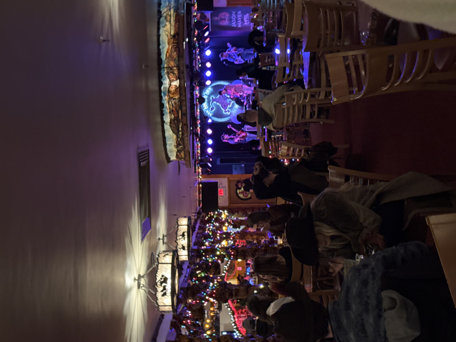 Inside a crowded restaurant, patrons fill tables beneath twinkling Christmas lights. A stage hosts musicians performing under bright spotlights and a circular neon sign. Above the stage, a decorative mural lines the wall. Ornate chandeliers hang from the ceiling. Patrons are seated at wooden tables with matching chairs, engrossed in the performance and their meals.