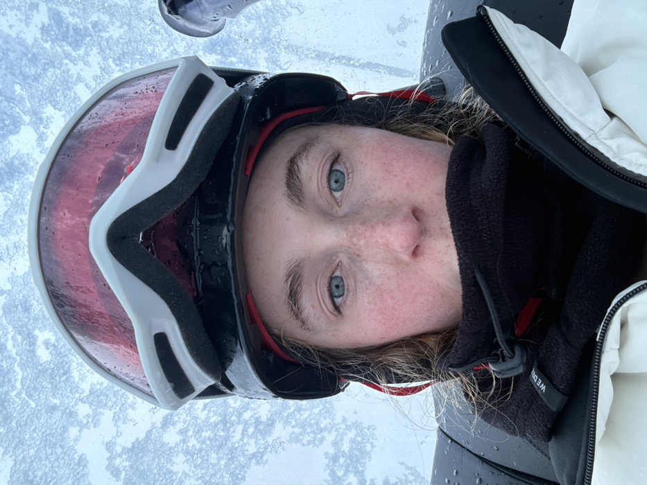 A female individual is depicted in a close-up, chest-up view, situated in a snowy outdoor environment in Les Allues, France