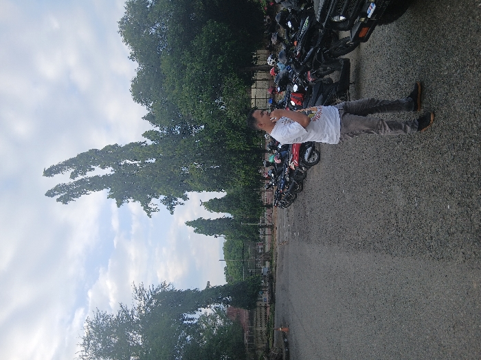 This image depicts an outdoor scene in Lhokseumawe, Indonesia, likely within a parking area or paved lot under a partially cloudy sky. In the foreground, an adult male stands facing slightly left, his right hand raised towards his mouth, appearing to hold an object, possibly a cigarette. He is wearing a white t-shirt with a graphic design, light grey trousers, and dark shoes. To the right of the male, the front bumper and a portion of the hood of a dark-colored vehicle are visible. Stretching diagonally from the mid-ground towards the left are approximately 10-15 motorcycles, mostly dark-colored scooters, parked in a line. In the background, tall, dense green trees line the perimeter, with some exhibiting a columnar growth habit. The ground is a dark, textured asphalt surface. A single orange traffic cone is present on the paved surface in the far left background.
