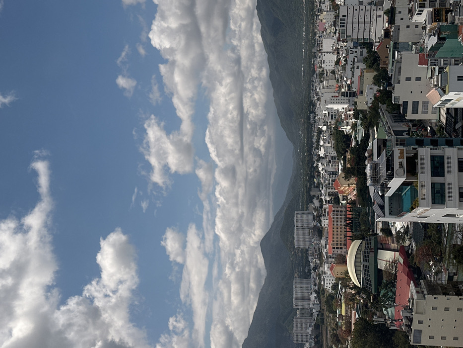 An aerial perspective reveals a densely populated cityscape nestled against a backdrop of verdant mountains. The sky is a bright blue, adorned with fluffy white clouds. The city features a mix of low-rise and high-rise buildings, painted in various hues. The mountain range appears lush and green, creating a natural boundary for the urban development. The combination of the natural and man-made elements gives a balanced and visually engaging composition.