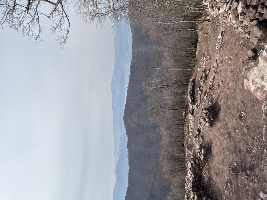 The image depicts an elevated outdoor scene in Praveshka Lakavitsa, Bulgaria, featuring archaeological ruins in the foreground and an expansive mountainous landscape. The immediate foreground consists of uneven, reddish-brown earth embedded with numerous irregularly shaped, dark reddish and gray stones, forming partial wall foundations and scattered debris. No human subjects or discernable activities are present in this area. Beyond the ruins, a dense forest of leafless deciduous trees covers rolling hills, indicating late winter or early spring conditions. The midground features individual bare trees with light-colored bark ascending a slope. In the background, successive layers of hazy mountains extend to the horizon, with the most distant peaks showing minimal traces of snow. A valley containing what appears to be a small settlement is visible between the closer forested hills and the distant mountain ranges. The sky is uniformly pale gray-blue, indicating overcast weather conditions.
