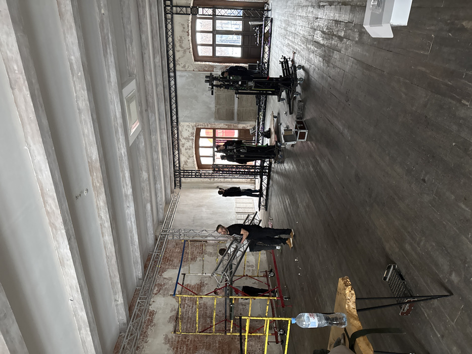 A large, open room, likely a renovated industrial space in Moscow, Russia, is depicted. The interior features exposed red brick on the left wall and distressed light-colored plaster on the right and rear walls. The ceiling comprises visible concrete beams painted a light off-white, with a single recessed rectangular light fixture. Dark, wide-plank wooden flooring covers the entire visible area. Multiple arched windows with dark frames are present on the right and rear walls, admitting ambient light. Seven adult males, dressed in casual attire, are present. Their actions suggest the handling and assembly/disassembly of event or production equipment. On the far left, a yellow and red rolling metal scaffold is positioned against the exposed brick wall. Two men in the mid-left are carrying a section of silver-colored metal truss. A larger, black metal truss system is partially erected, forming a structure along the right and rear sections of the room. Several black, wheeled equipment stands, characteristic of camera or lighting support, are distributed across the mid-right floor. A small wooden table with a live-edge surface and black hairpin legs stands in the immediate foreground-left, holding a plastic bottle of "Lipetskaya Rosa" water. An open white cardboard box and other miscellaneous small equipment items are visible on the floor.