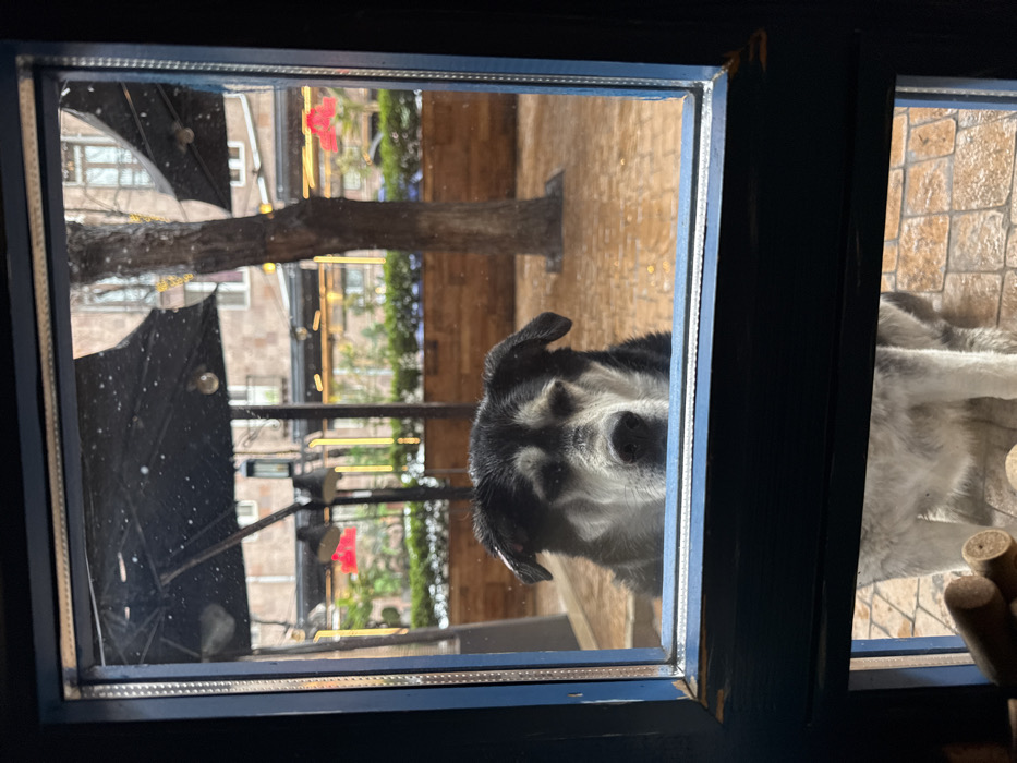 The image displays an exterior scene viewed from an interior perspective through a dark blue-framed window or door panel, situated in Yerevan, Armenia. A medium-to-large dog, exhibiting black fur on its head and back, and white/light grey fur on its muzzle, chest, and legs, stands directly outside the window, facing inward. Its fur appears damp, and its eyes are partially closed or narrowed. The exterior environment consists of a paved patio or courtyard with reddish-brown interlocking pavers, visibly wet from light precipitation, which manifests as small white specks on the window glass and in the air. The lighting is dim, suggesting overcast conditions or evening, augmented by numerous string lights draped across the outdoor space and dark suspended light fixtures. Other background elements include large dark patio umbrellas, a leafless tree, and a multi-story building facade with windows. A low wooden planter containing green foliage is also present. In the blurred interior foreground, a cluster of cylindrical wooden objects, consistent with wine corks, is partially visible in the bottom-left corner. No human subjects are present or actively interacting within the visible frame. The dog maintains a stationary posture, gazing into the interior.