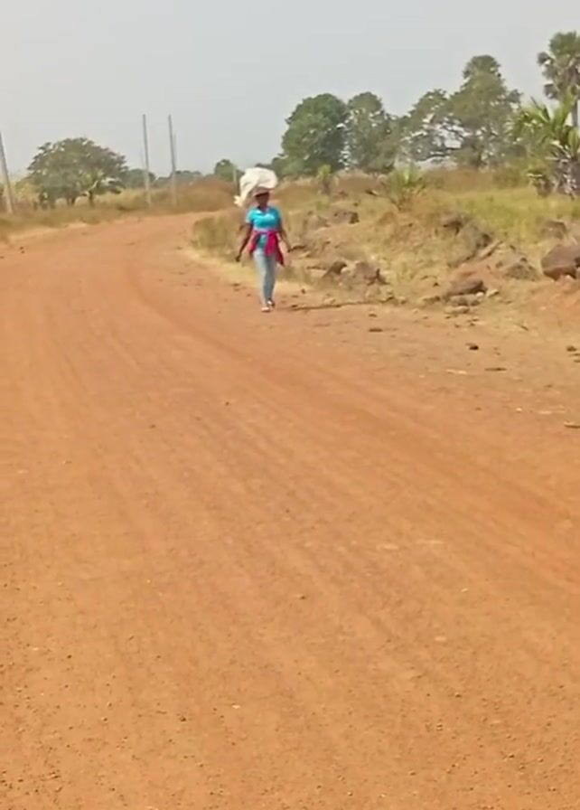 A video shows a woman walking down a red dirt road away from the camera. She carries a large white bag on her head. She is wearing blue jeans, a turquoise shirt and a red sweater tied around her shoulders. The landscape is dry and grassy with scattered trees and rocks. The sky is pale and hazy. There are wooden utility poles alongside the road.