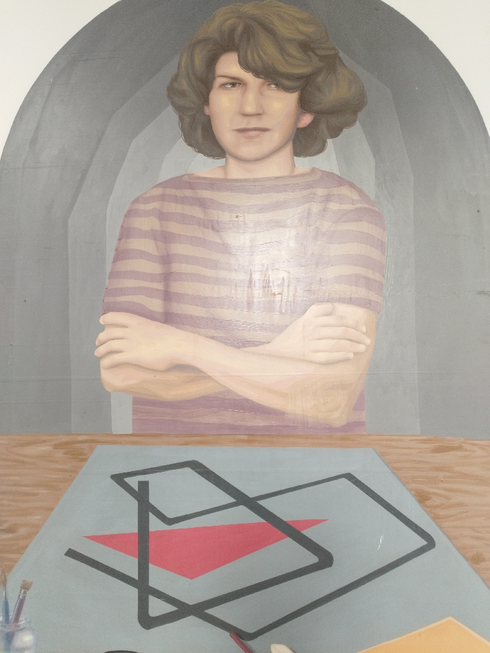 A painting depicts a person with shoulder-length brown hair, wearing a striped purple shirt, standing with arms crossed. A gray arched background frames the figure. In front of the person, a wooden table displays a blue canvas with a red triangle and black lines forming geometric shapes. A jar of paintbrushes is on the left, and an orange rectangle is visible on the right.