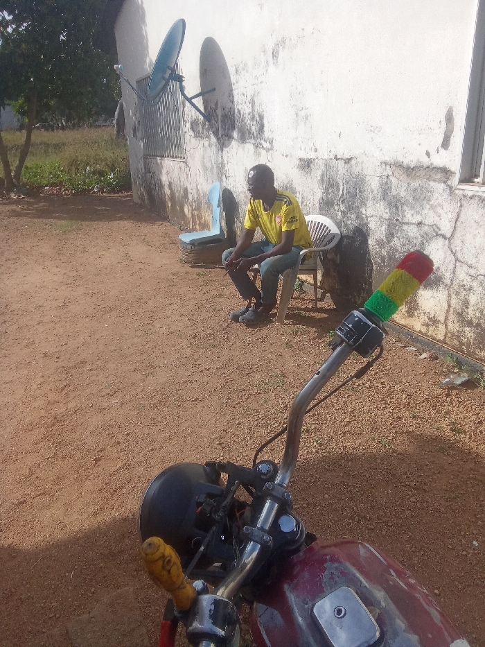 A man sits outside a weathered building with satellite dishes. He wears a yellow t-shirt and jeans, and he is seated in a white plastic chair. Next to him is a blue chair made from a repurposed tire. In the foreground, a motorcycle's handlebars, headlight, and fuel tank dominate. The handlebars have colorful grips: one with green, yellow, and red stripes, and the other yellow. The ground is dirt or sand.
