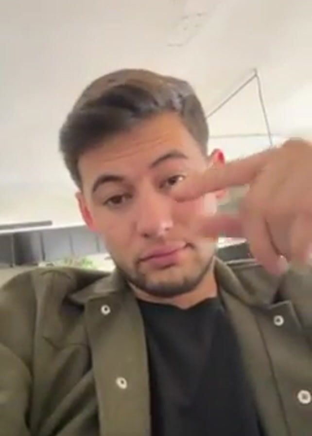 A man is centered in the frame. He wears a black shirt and a green jacket. He has brown hair, a stubbled beard, and appears to be indoors. He makes the "call me" hand gesture, then a thumbs-up. The background is a ceiling and hints of interior decor.