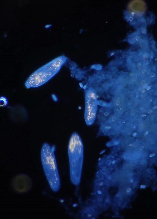 microscopic view of several translucent, blue, oblong shapes. These shapes appear to move around in a dark, liquid environment. To the right of the shapes is a cluster of smaller blue dots. There are a few out-of-focus orbs in the foreground.