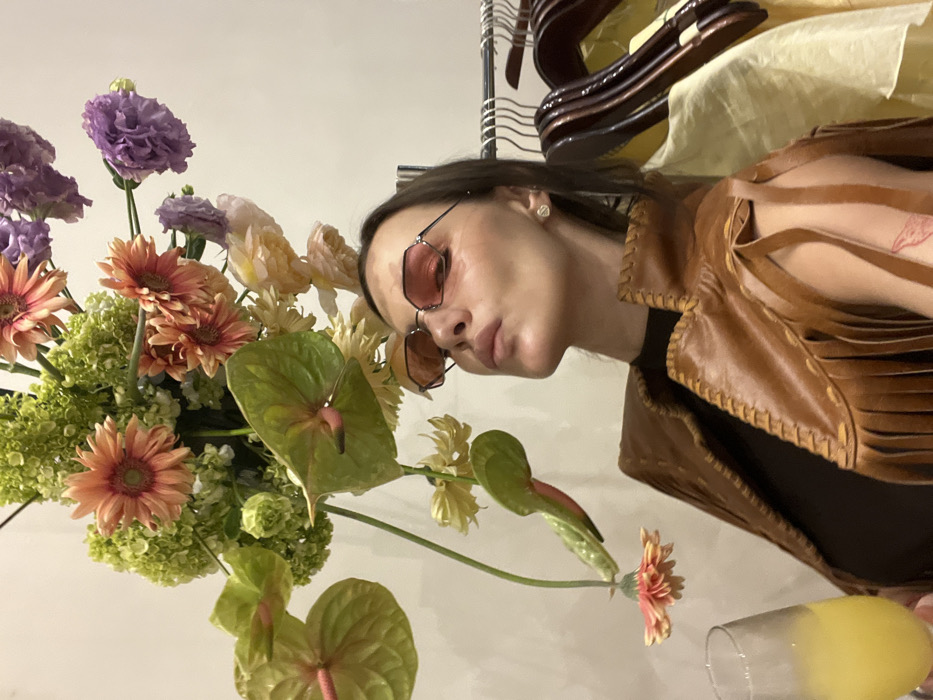 A female subject is depicted in an indoor setting, reportedly in Pecatu, Indonesia. She is visible from the chest up, facing the viewer with her head tilted slightly upward and to her left, lips pursed, and wearing octagonal-framed sunglasses with pink-tinted lenses. Her dark hair is styled down. She wears a black garment beneath a brown leather vest featuring fringe details and decorative light-colored stitching. An earring is visible in her right ear, and a red tattoo is present on her left upper arm. Her left hand holds a clear stem glass containing a yellow-orange liquid. Above her and to her left, a large floral arrangement is suspended, comprising green hydrangeas, orange gerbera daisies, purple lisianthus, pale yellow/peach roses, and green anthurium flowers. Behind her right shoulder, a clothing rack with multiple wooden hangers holds light-colored garments, one appearing yellow. The background consists of a plain, light-colored wall.