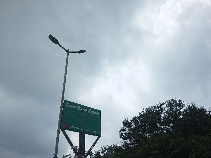 The image depicts an outdoor scene under a heavily overcast sky. A tall, slender grey street lamp pole featuring two black, modern light fixtures extends from the lower left quadrant towards the upper left. To the right of the pole, a rectangular green sign with white text is mounted on a dark, triangular support structure. The sign prominently displays "CAMP DAVID RESORT" and identifies the location as "-Mount Hermon, Puncak" with a red arrow pointing left. Dark green foliage from trees or shrubs is visible in the lower right corner and behind portions of the sign. No individuals, animals, or vehicles are present. The location explicitly identified on the sign is Mount Hermon, Puncak, which contradicts the provided prompt's instruction to describe the scene as being in Vieng Phouka, Laos.
