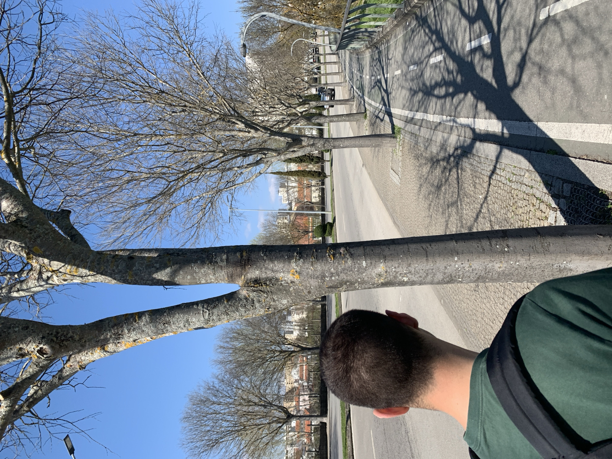 The image depicts an outdoor urban scene on a clear, sunny day in Bragança, Portugal. In the lower left foreground, the back of a male individual is visible, wearing a dark green t-shirt and a black backpack. His head is turned slightly to the right. A prominent deciduous tree with bare, lichen-covered, bifurcated trunks stands centrally in the mid-foreground. To its left, a multi-lane asphalt road with a paved shoulder and a cobblestone sidewalk stretches into the distance. A row of similar bare deciduous trees lines the road and a separate paved pathway. Beyond the road, various urban buildings, some with terracotta roofs, and taller structures are visible against the horizon. To the right of the central tree, a dedicated paved pathway, likely a bicycle lane, is marked with white dashed and solid lines. This pathway runs parallel to the road and is bordered by a metal railing on its right. Modern streetlights with curved arms are visible along both the road and the pathway. Long, distinct shadows from the trees are cast across the pathway and ground, indicating strong, low-angle sunlight. Several vehicles are present on the distant road. The sky is clear blue and cloudless.
