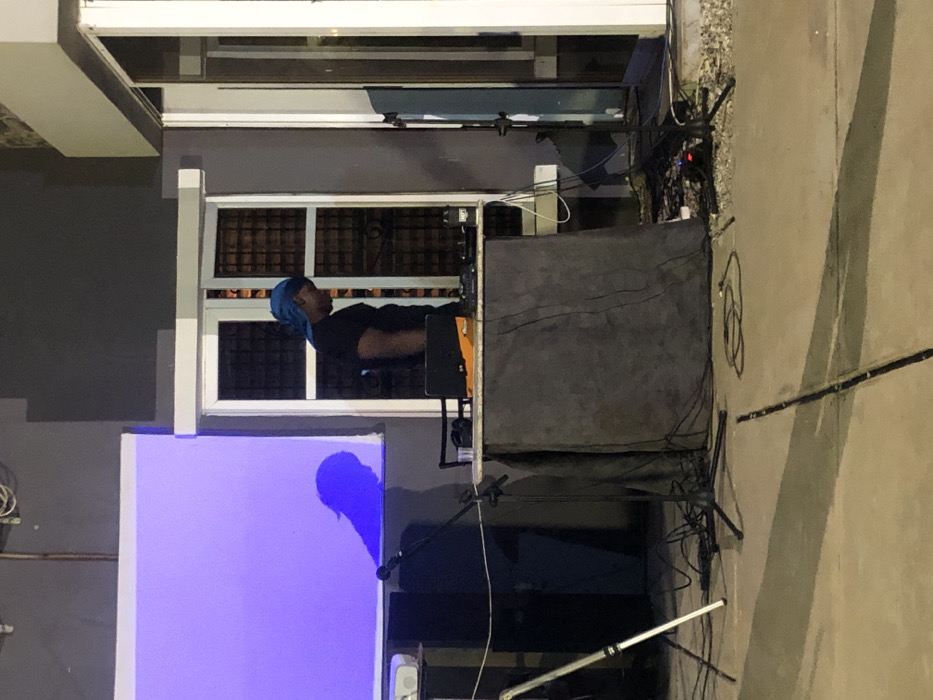 A person with a blue head covering stands behind a dark gray stand, possibly a DJ booth, with a laptop on top. They are positioned near a window with white frames. A large screen displaying a purple hue is visible to the left. Cords and wires are tangled around microphone stands and other equipment, suggesting a live event setup. The scene appears to be outdoors, potentially in a yard or patio area next to a building.