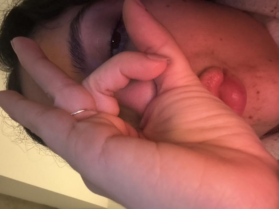 A person's face is visible, with an eye and eyebrow prominent in the upper left. Part of the nose and cheek are visible, with some skin imperfections. A hand obscures part of the face, positioned in a gesture where the thumb and index finger form a circle, while the other fingers extend upward. A ring is visible on one of the fingers. The image has a slightly reddish tint overall.