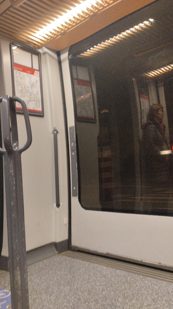 Inside a train car, a map is mounted beside a grey pole. A door, slightly ajar, features a vertical handrail and a grey mechanism. Reflected in the door's window is a woman seated. The ceiling is lined with parallel light fixtures that emanate a bright glow, illuminating the speckled floor below. The scene conveys a sense of public transportation.