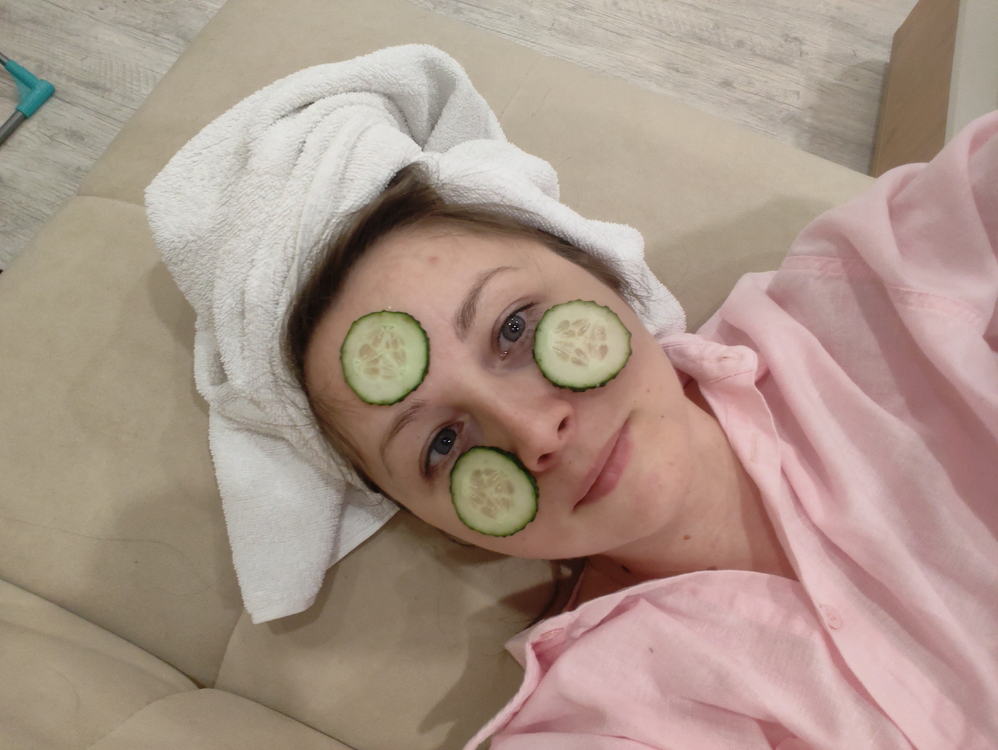A person is lying on a beige couch. The person is wearing a white towel wrapped around their head and a pink collared shirt. There are three slices of cucumber on the person's face, one on each eye and one on the right cheek.