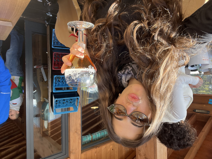 - "A young adult female is centered in a selfie, holding a stemmed glass containing a light amber liquid with foam, branded as Leffe beer, in her right hand" by FM-bfXKt1, licensed under CC BY 4.0