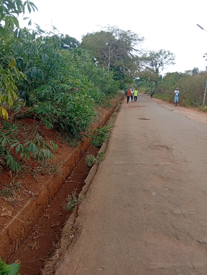 The image depicts a rural or semi-urban road scene in Nsukka, Nigeria, under an overcast sky. A narrow, dark gray paved road, exhibiting signs of wear and minor patches, extends from the lower right foreground into the distance. To the left of the road, a shallow, concrete-lined drainage ditch, approximately 30-40 cm deep, runs parallel to the pavement. The ditch contains dried organic debris and sparse weeds. Immediately beyond the ditch, an embankment of reddish-brown soil supports dense, green foliage, primarily large-leafed plants resembling cassava, which line the left side of the road. Further into the scene, a group of four individuals walks away from the camera along the road. The lead person wears an orange shirt, followed by another in a light green/yellow shirt, and two others in dark clothing. Further down the road on the right, a solitary individual stands or walks slowly, wearing a light-colored top and trousers. Another distant figure in dark clothing is visible on the far left side of the road. In the mid-background, a streetlight pole with a single luminaire arm is visible on the left side of the road. The background consists of numerous trees and dense green vegetation, contributing to a lush environment. The overall lighting suggests daytime with diffused sunlight.