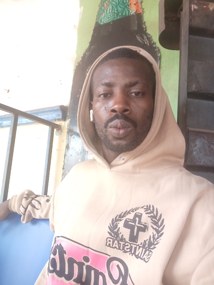 A male individual, presumed to be an adult, is depicted in a frontal medium-close-up. He has dark skin, short dark hair, a trimmed mustache and beard, and a white wireless earbud in his left ear. Distinct linear scars or marks are visible on both cheeks, with a prominent example on the left cheek. He wears a beige hooded sweatshirt with the hood covering his head. The sweatshirt features a mirrored graphic print on the chest: a black cross within a laurel wreath, text 'SAINT STAR', and a partially visible pink rectangular graphic with dark script. His left arm rests on an obscured blue surface. The background consists of a textured, multi-colored wall. To the left, a light-colored wall section shows signs of wear and a black metal railing. To the right, a darker, green-painted section of the wall displays abstract green and orange/brown patterns. A dark vertical structural element is present in the upper right background. The specific location within Zaki Biyem, Nigeria, is not discernible from the image's visual content.