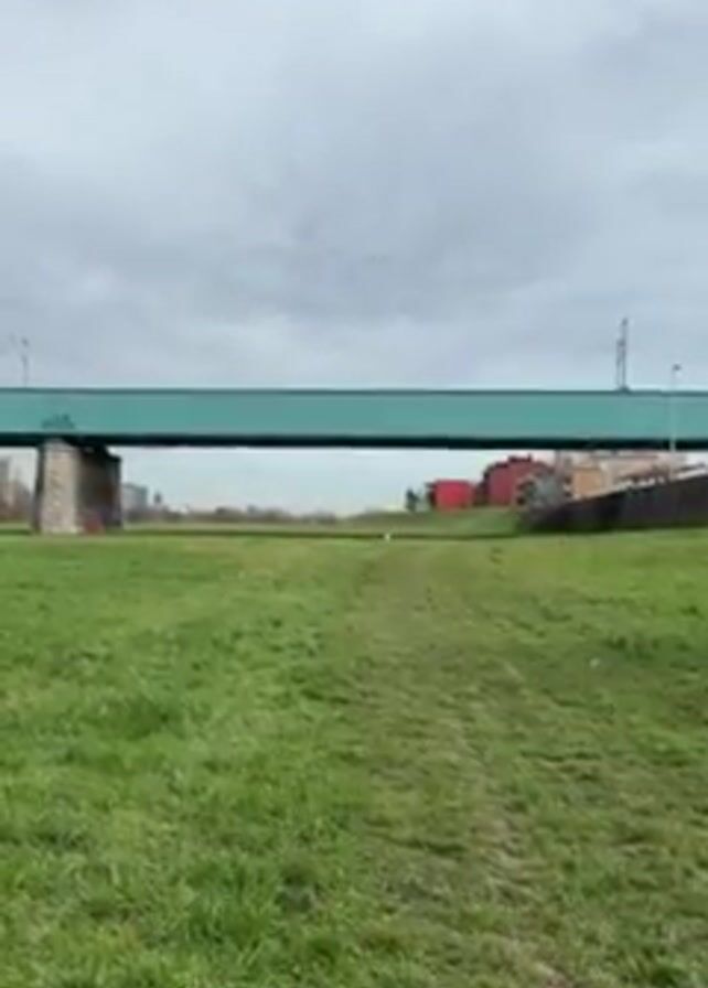 The camera is static, showing a grassy field under a green overpass