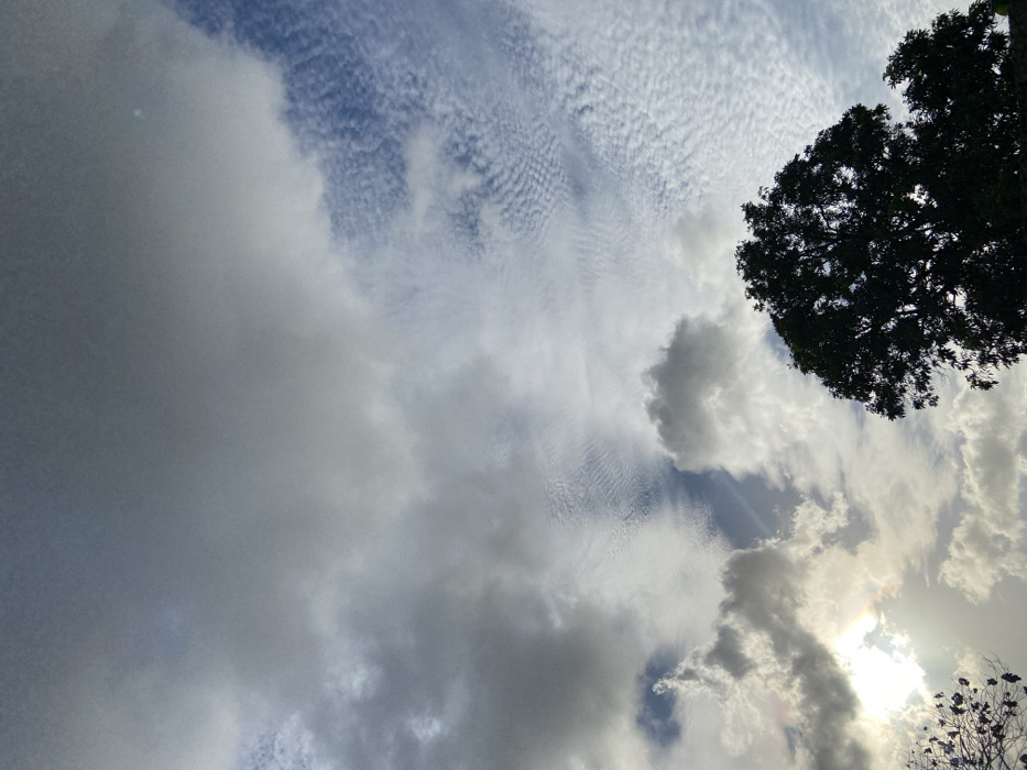 A sky filled with various cloud formations. To the left, dense, grey clouds dominate, while overhead, rippled, high-altitude clouds are visible against the blue. To the right, puffy white clouds frame a glimpse of the sun. A tree with dark foliage occupies the upper right corner, contrasting against the bright sky. Another tree, silhouetted, appears at the bottom right.