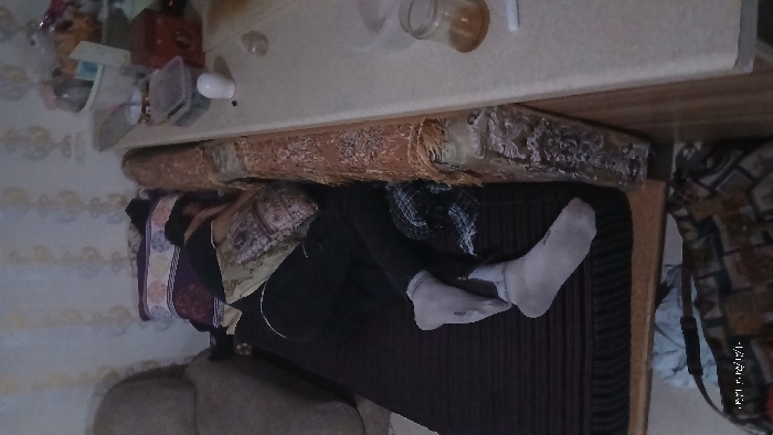 A person lies on a dark brown couch or bed. They wear black pants and gray socks. Part of a pillow with purple and tan patterns is visible behind the person's head. A beige-colored surface, likely a table or countertop, is above the person. A brown cushion rests between the surface and the person. Part of a patterned bag sits near the edge of the bed.