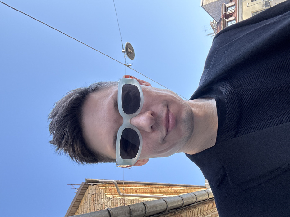 The image is a well-lit, frontal selfie depicting a young adult male outdoors under a clear blue sky. The individual, appearing to be in his late 20s to early 40s, has short, dark, textured hair styled upwards. He wears rectangular, light green-tinted sunglasses with dark lenses and small, metallic, wire-like ear hooks visible behind the frames. A subtle, closed-mouth smile is present on his face. He is dressed in a dark, textured knit sweater visible beneath a dark, collared coat or blazer. In the upper left background, part of a light brown brick building with a visible downspout is present. The upper right background features a clear blue sky, traversed by overhead utility wires. Suspended from these wires is a distinctive circular street lamp, which has a prominent capital 'J' symbol etched into its light-emitting surface. This specific street lamp design confirms the location as Gedimino prospektas (Gediminas Avenue) in Vilnius, Lithuania. Faintly visible in the far right background are the tops of other urban buildings, characterized by sloped roofs and windows. The scene suggests a sunny day in an urban environment.