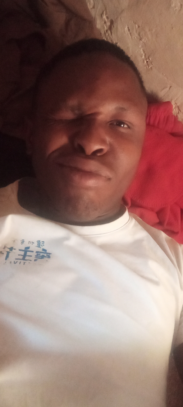 A man winks at the camera while lying down. He is wearing a white t-shirt with a blue inscription in what appears to be Mandarin or Japanese. He has short black hair and dark skin. A red blanket is visible beside his head. The background is slightly out of focus and appears to be a wall with a textured surface.