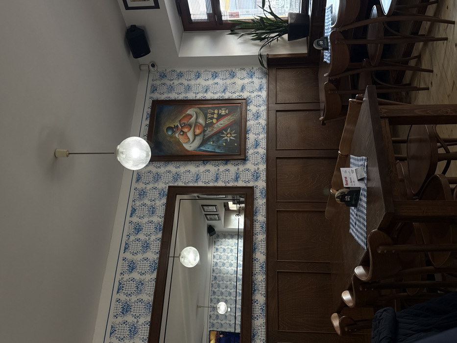 This image depicts the interior of a dining establishment in Stupava, Slovakia. The room features a white ceiling from which a single ribbed spherical pendant light hangs. The walls are horizontally divided: the upper section is adorned with blue and white patterned wallpaper featuring a floral and lattice design, while the lower section consists of dark wooden paneling. On the left wall, a large rectangular mirror with a dark wooden frame reflects a portion of the room, including another pendant light fixture. To the right of the mirror, a framed portrait painting is mounted, portraying a caricatured figure with a prominent white mustache, a red nose, a small black hat, and a blue uniform decorated with several medals and a star. In the upper right corner, a black speaker and a small white security camera are affixed to the wall. Multiple dark wooden tables and matching chairs are arranged throughout the space. In the foreground, a table is set with a blue and white checkered table runner, a "Reserve" sign, and a small table tent. A similar table setup is partially visible on the right side of the frame. A dark, quilted jacket is draped over a chair in the lower left. A window with horizontal blinds is visible on the right, with a tall, green snake plant in a black pot resting on the windowsill. No individuals are present in the scene.