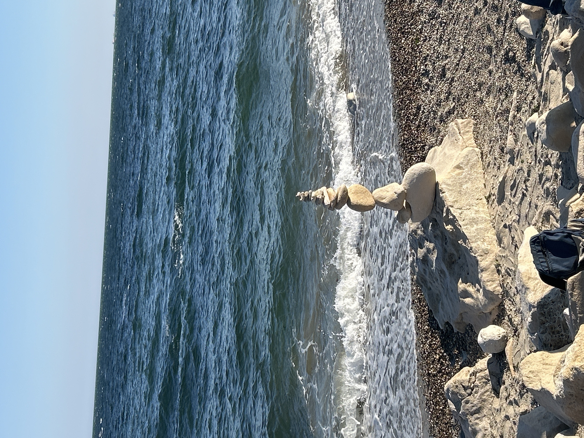 A slightly rotated, eye-level shot captures a serene beach scene. On the right, a stony shoreline transitions into a pebbled beach. The stones vary in size and color. On the right, a dark navy blue bag is situated on the stony shore. At the center, a line of evenly stacked stones leads to the shoreline. These stones appear to be purposefully arranged in a tower-like structure. To the left, the sea stretches out under a clear blue sky. White foamy waves softly roll onto the shore, adding a sense of motion to the scene. The water reflects a deep blue, matching the sky's color. This is probably in the city of Varna, Bulgaria, because it is the only place I have images of this beach.